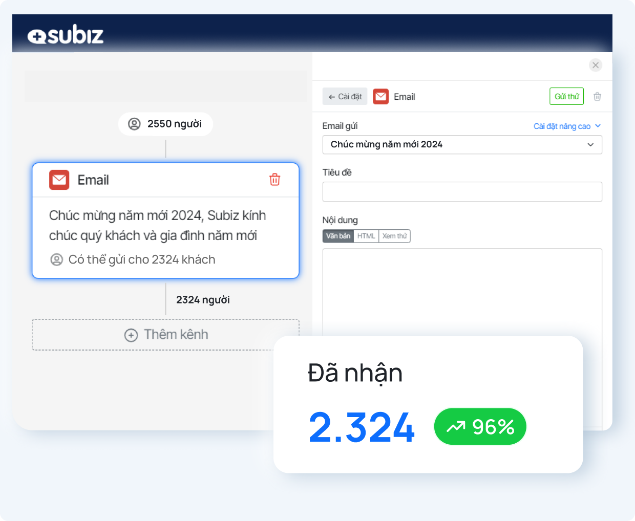 Gửi email chứa thông điệp dành riêng cho từng phân khúc khách hàng. Không giới hạn số lượng email nhận trong một lần gửi.